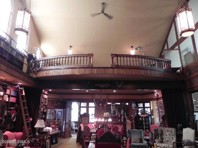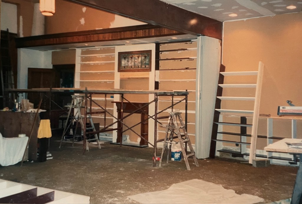 Bookshelves and a fireplace were built on the interior wall of the back section of the building, also a catwalk and more bookshelves that connected it all to the loft.