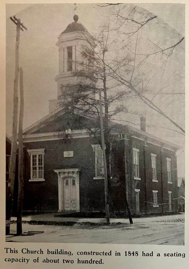I find it remarkable that the congregation had a beautiful brick church that at the turn of the 20th century, they chose to tear down and instead build a new bigger church, but such is the nature of a thriving congregation. You can still see the masonry from the original church in our basement. The new church was built on the same spot, but the new building is wider than the original foundation.