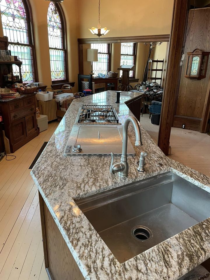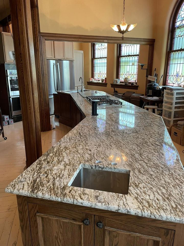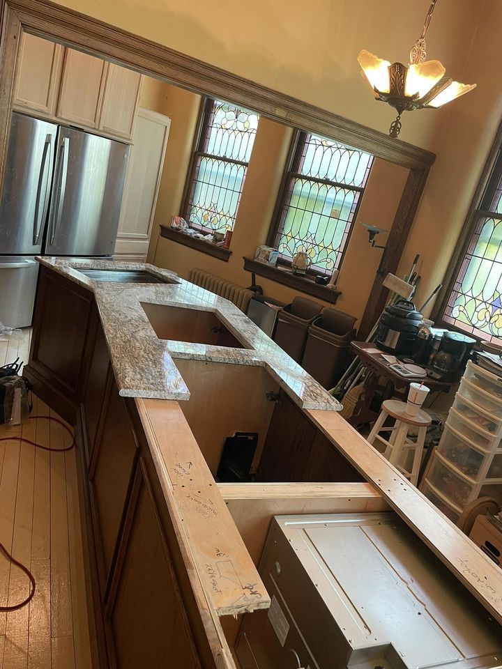 Countertops arrived. Watching them be lowered into place was worrying, but none of the awkward granite pieces broke.