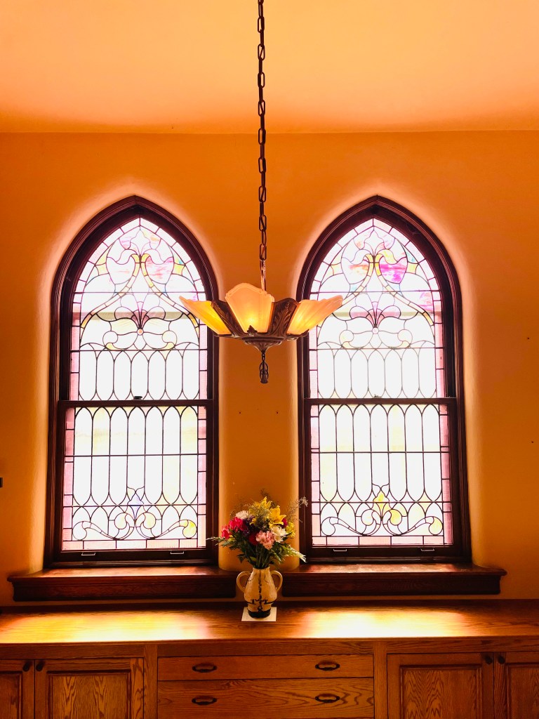 On our first visit to the church in March 2021, we felt like bulls in a china shop trying to negotiate our way through this beautiful building filled with amazing antiques, tying not to break anything,. We walked past the enormous round table under an amazing chandelier and got to the far section of the building which is ringed with stained glass windows, and the westward facing sunlight was pouring in and and it seemed like a kaleidoscope was infusing the room with color.
