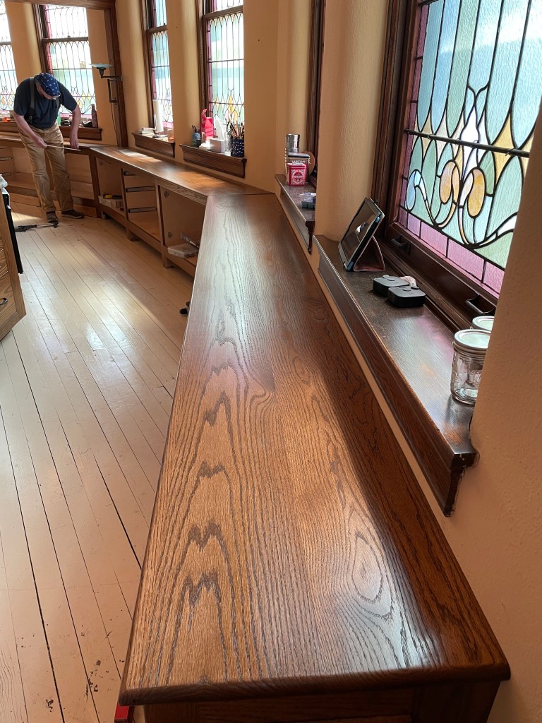 Cabinetry was built along the back wall underneath the stained glass windows so that they would look like vestment chests and not look totally out of place, but with the stain and the wood matching what is already here, they blend in.
