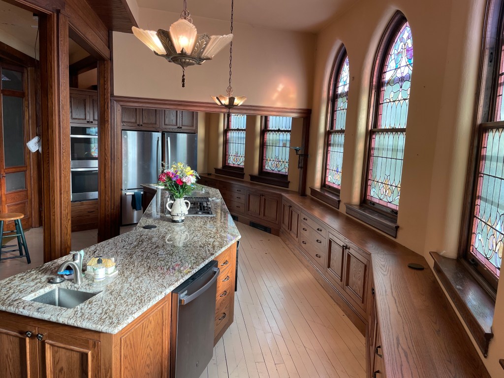 As alluded to earlier, one of the first big projects was to build a gorgeous kitchen in the back half of the building, the semi circular space surrounded by a circle of stained glass windows. Here are some photos of this work by Robert Bittner, a Master woodworker who happens to be a good friend. (Who else would take on this kind of project!)
