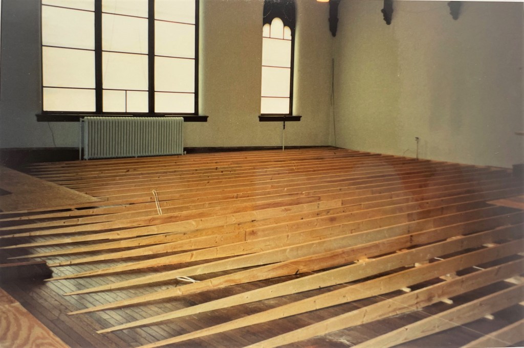 So many things had to happen! The Sanctuary was built with a slope in the floor towards the altar, so that flooring had to be leveled to be able to use the space. Several stained glass windows were taken to the new church and had to be replaced. I’m not really sure what happened to the organ, but that space was vacated as well as the altar area and it’s stained glass window.