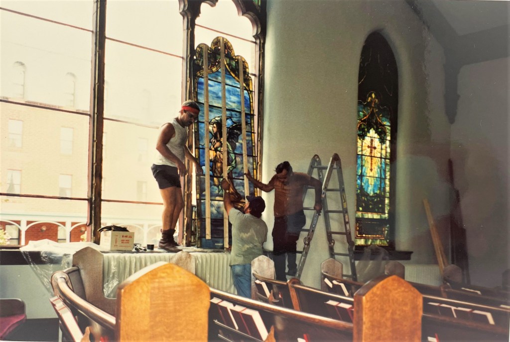By the 1970’s, repairs and updates were needed again, especially with the church looking towards celebrating its 150th anniversary in 1974. It seems that everyone helped out, raising money via chicken barbeques and making hundreds of donuts in the church basement kitchen, and also washing the Tiffany windows and refinishing the floors and pews.