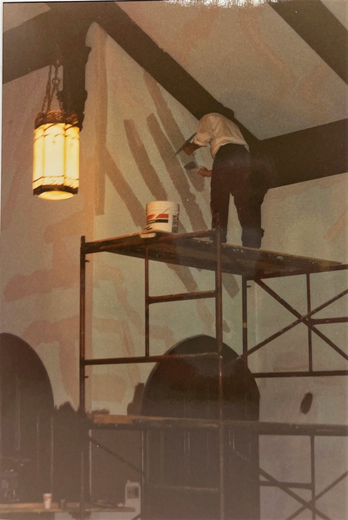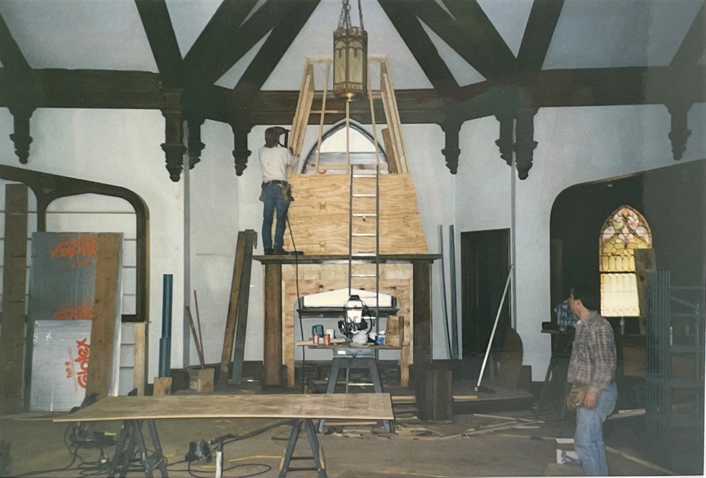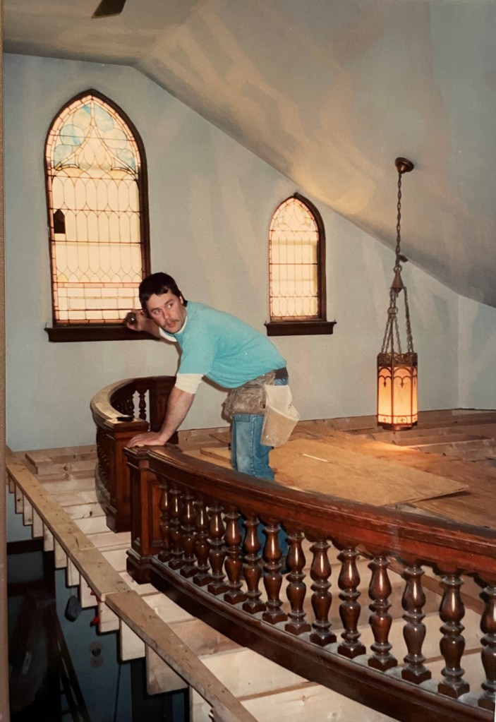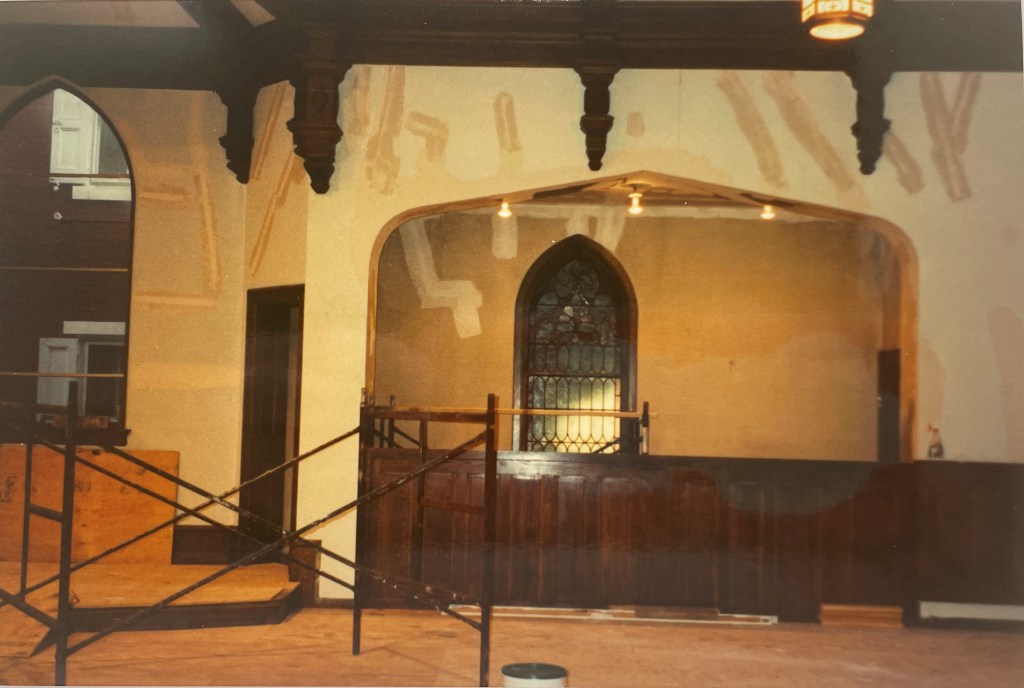 He built a bar where had been a passageway to the side door and the Pastor’s office, and painted and repaired the plaster. It was quite the overhaul.